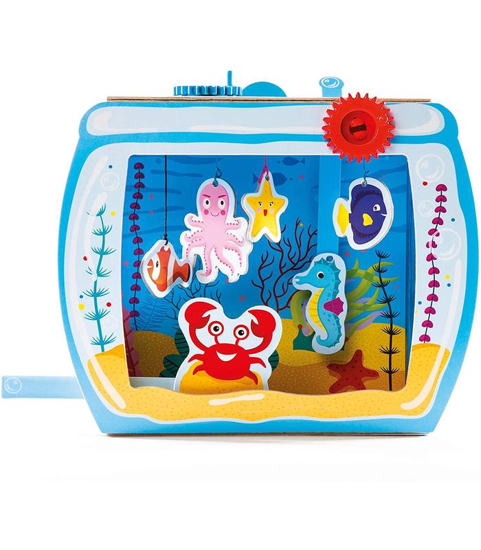 Este juguete también contiene un fondo para colorear y palancas para mover los peces y que naden hacia fantásticas aventuras