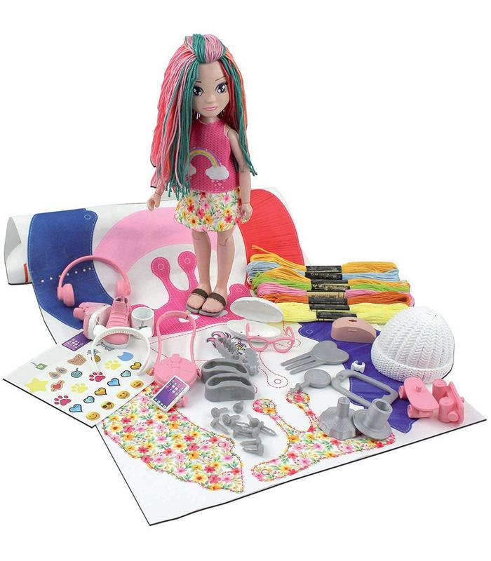 La caja incluye todos los elementos necesarios para crear conjuntos de moda "casual": ropa de calle, deportiva, para el día a día. Contenido: - 1 muñeca articulada para montar - Tela con patrones preimpresos - Accesorios de moda - Clips para ropa - Lana para pelo - 1 herramienta perforadora - Instrucciones y video instrucciones.