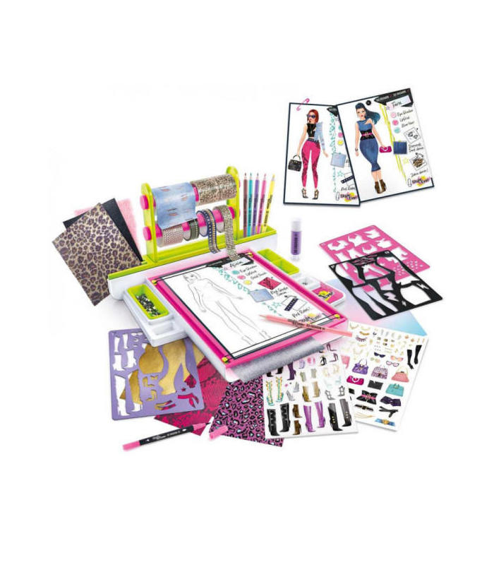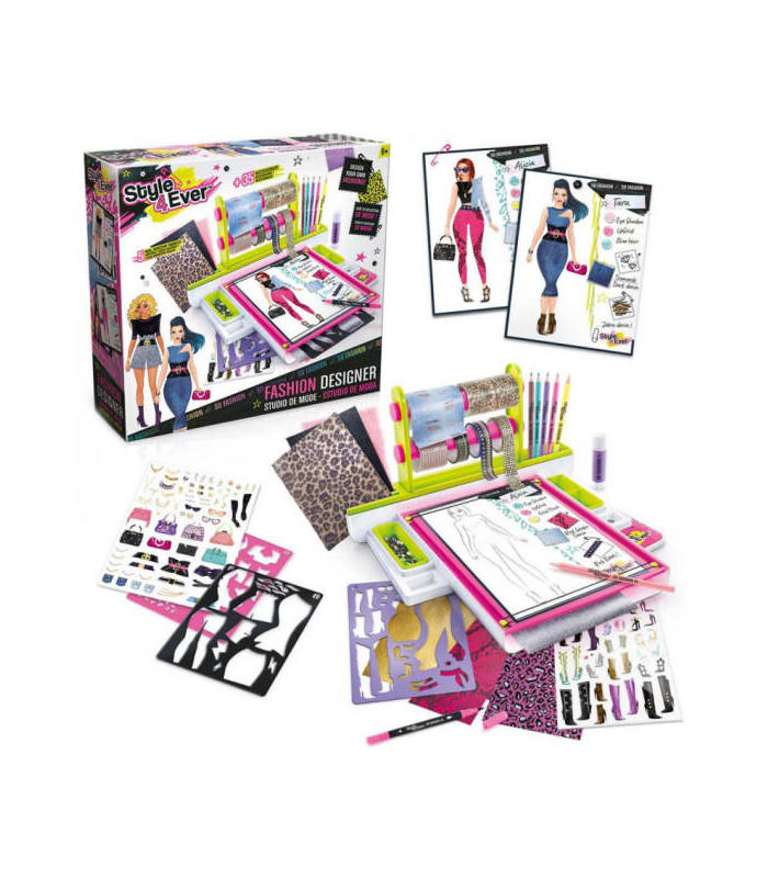 ¡Demuestra tu talento como estilista y crea tu colección con este Fashion Studio! Los numerosos accesorios incluidos te permitirán hacer muchos conjuntos fácilmente. Está equipado con todo lo que el diseñador necesita: plantillas, telas, papeles impresos, cintas, pegamentos, tijeras, lápices…