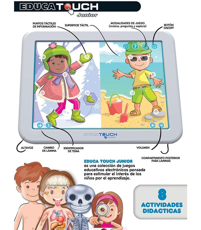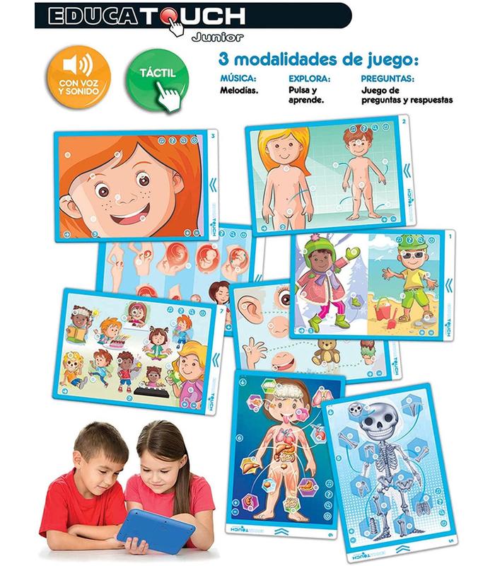 Con Educa Touch Junior Aprendo El Cuerpo Humano los más pequeños descubrirán las diferentes partes del cuerpo, aprenderán cuáles son los 5 sentidos y a qué parte del cuerpo los asociamos, conocerán los principales huesos del esqueleto, conocerán los principales órganos y su utilidad, descubrirán cómo se forma un bebé en el seno materno.