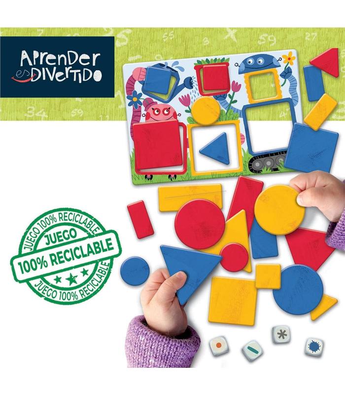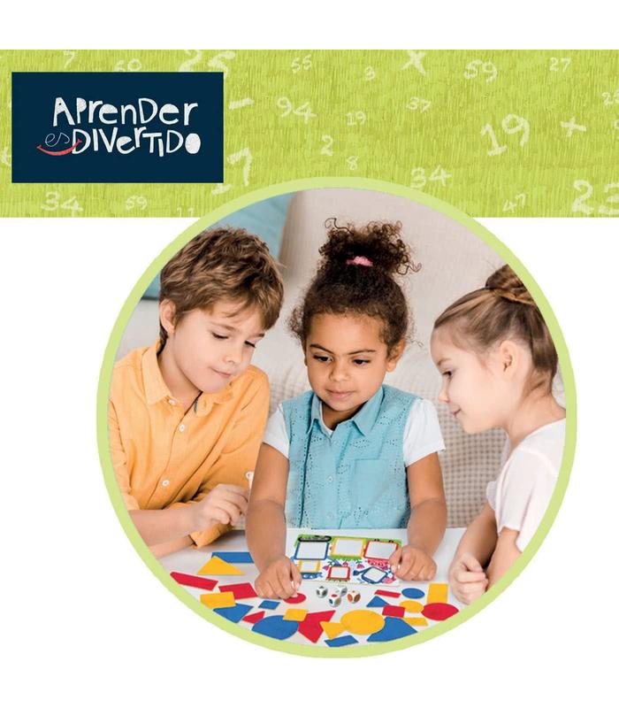 48 figuras de 4 formas distintas (CUADRADO, RECTÁNGULO, TRIÁNGULO Y CÍRCULO), de 3 colores (AMARILLO, ROJO, AZUL), de 2 grosores* (GRUESO Y FINO) y 2 tamaños (GRANDE Y PEQUEÑO) con las que los niños aprenderán los distintos conceptos y aprenderán a hacer asociaciones. 4 dados les indicarán qué formas deben buscar. ADVERTENCIA: No recomendable para menores de 3 años, ya que contiene piezas pequeñas que podrían provocar asfixia en caso de ser ingeridas por el niño/a.