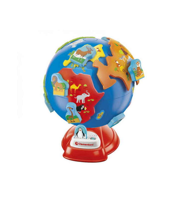 Edad: 3-5 años. Un gran globo electronico, hecho de plastico recliclado: con continentes y animales para montar y aprender muchas curiosidades sobre ellos y su habitat. El globo tambien ofrece divertidos cuestionarios a los que el niño puede responder insertando el animal correcto en la base del globo. La diversion continua con el juego de ruta cooperativo, con el objetivo de viajar por todo el mundo antes de que llegue la tormenta, respondiendo los cuestionarios que ofrece el globo terraqueo.