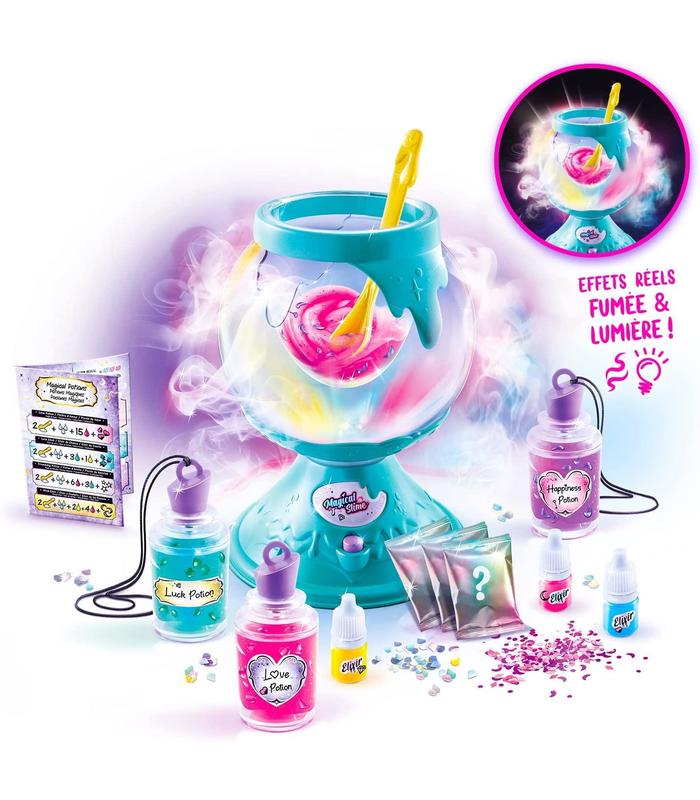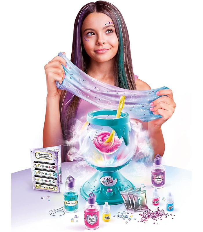 CONTIENE: Un caldero mágico, polvo de Slime, 3 polvos reveladores de color, 3 elixires de colores, 1 cuchara mezcladora, 1 cuchara medidora, 3 viales, hilo y una guía de recetas y predicciones de pociones mágicas.