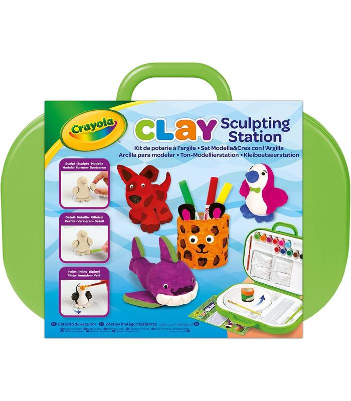 Los niños pueden moldear y crear sus propias obras en arcilla, tallarlas con las herramientas, pintarlas y finalizarlas con las témperas incluidas.