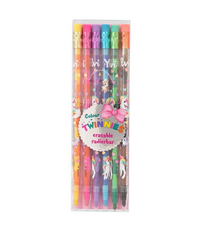 6 lápices, ¡12 colores! Cada uno de esstos lápices mecánicos de Ylvi rematados con una goma de borrar en la parte superior dibuja en dos colores: amarillo/naranja, rosa/rojo, lila/lavanda, turquesa/azul, verde/verde claro y marrón/negro. Solo hay que extraer la mina que se desee cambiar por la parte de abajo y volverla a introducir por arriba para que empuje a la nueva. Y lo mejor ¡es que son fácilmente borrables!