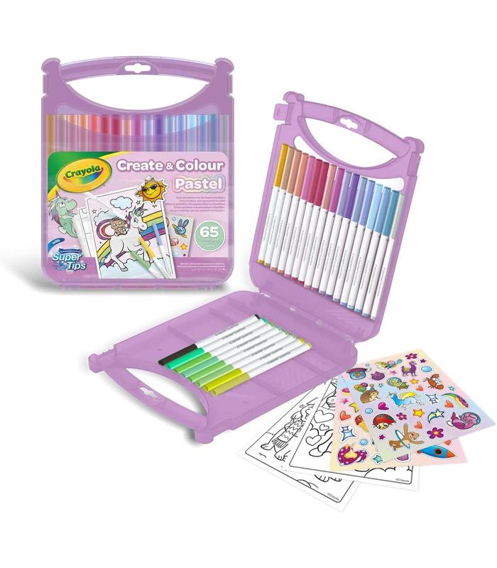 Kit creativo: 25 rotuladores SuperTips lavables, 20 páginas para colorear, 18 hojas blancas, 5 hojas de pegatinas dentro de un práctico maletín de plástico con asa