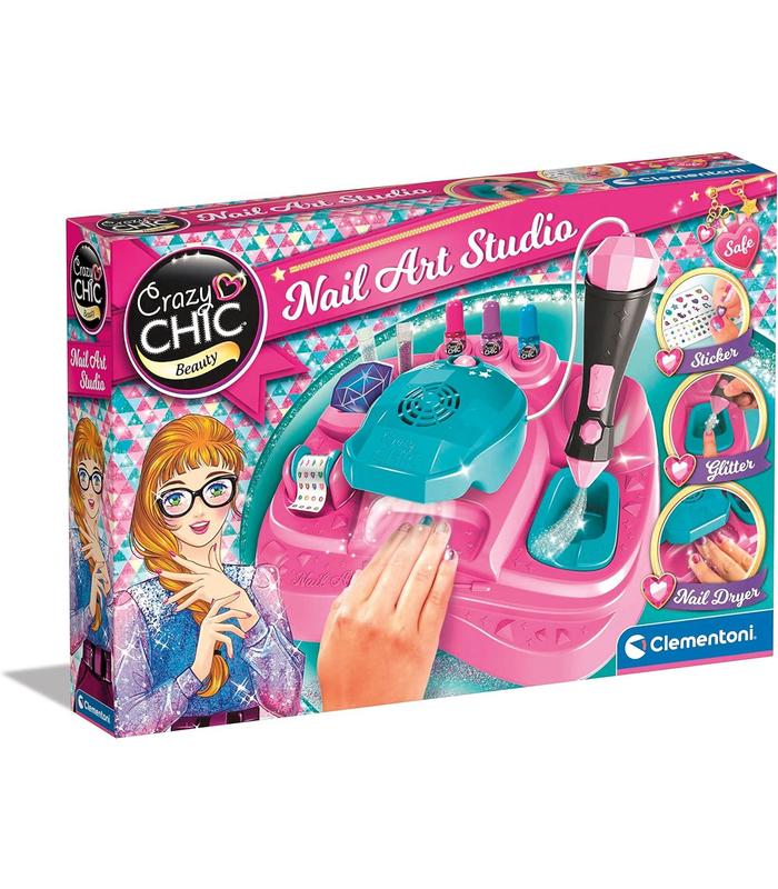 El kit contiene esmaltes de uñas Crazy Chic, pegatinas para uñas y purpurina de colores para una decoración con mucho glamour.