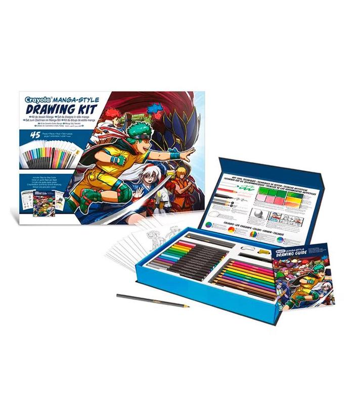 Un abundante conjunto que incluye todo lo necesario para aprender los principios del arte Manga: dibujar, colorear y difuminar sus proprios personajes. Incluye una guía paso a paso muy útil, Ideal para noveles y también para aprender nuevas técnicas de dibujo. Más de 50 pzs para ampliar tu conocimiento artistico. ¡ideal para aficionados del genero Anime y Manga o para quien da sus primeros pasos en el arte! Contenido: 10 lápices de colores, 13 rotuladores supertips lavables, 2 lápices de boceto, 1 rotulador negro punta delgada, sacapuntas y borrador Guía paso-a-paso para aprender a dibujar (32 páginas), 10 hojas para dibujar, 5 hojas para calcar