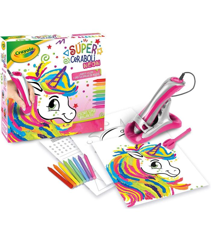 CRAYOLA SUPER CERABOLI: el bolígrafo mágico que permite derretir los lápices de cera para crear dibujos. CREA CON TOTAL SEGURIDAD: la punta no quema y se mantiene a una temperatura baja constante lo que permite una dispensación continua de la cera además, la cera se seca rápidamente cuando entra en contacto con la superficie. CREATIVIDAD SIN LÍMITES: muy fácil de usar, basta con introducir tus lápices Crayola (sin la envoltura), conectar el dispositivo y esperar a que la luz se ponga verde para empezar a crear tus propios dibujos; la cera fundida permite escribir, colorear, decorar y dibujar en cualquier tipo de superficie (cartón, cristal, madera, cerámica o tela). REGALO CREATIVO: ideal como regalo de cumpleaños y otras ocasiones especiales, para niños y niñas a partir de 8 años. INFORMACIÓN ÚTIL: incluye 1 Super Pen con base de apoyo y adaptador, 8 lápices de cera Crayola, 1 herramienta multifunción, 3 hojas de guía de 20x25 cm; peligro de asfixia - contiene piezas pequeñas; para utilizar solo con lápices de cera Crayola
