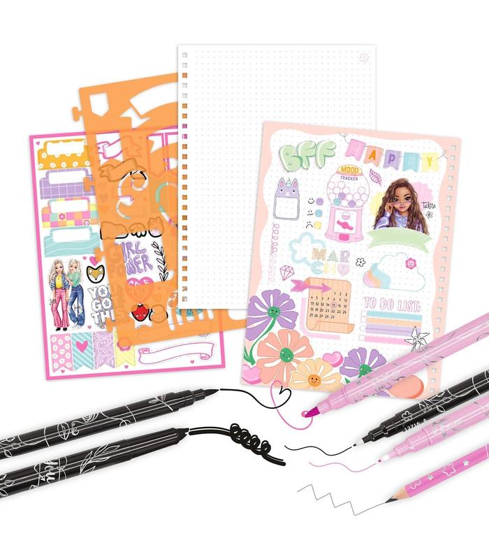 Incluye pegatinas, 1 plantilla, 1 lápiz (HB), 2 rotuladores de doble punta de fibra (rosa/negro) con punta de pincel y punta fina y 1 rotulador manual mágico en un pequeño estuche para lápices