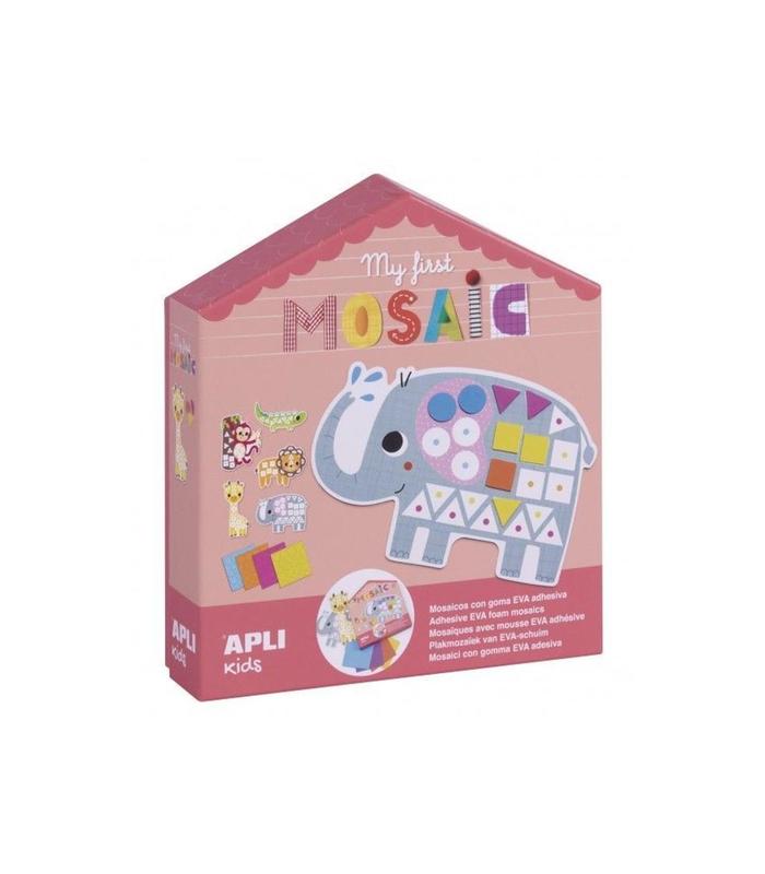 C. My Firts Mosaic 5 láminas precortadas con la forma de diferentes animales de la selva y 8 láminas de goma Eva con 4 colores surtidos. El niño deberá rellenarlos con la goma Eva del color correspondiente.