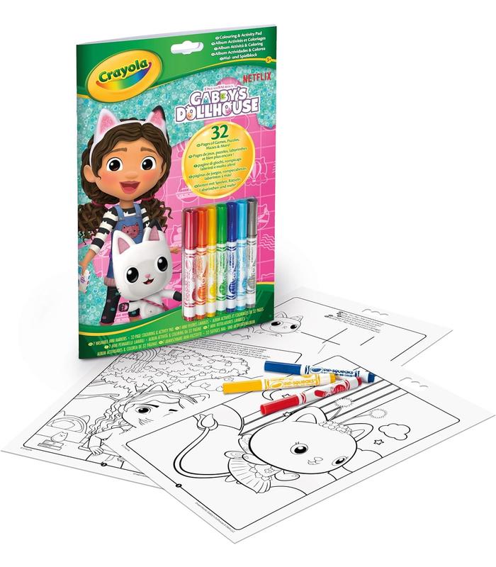 ÁLBUM PARA COLOREAR LA CASA DE MUÑECAS DE GABBY: Contiene 32 páginas para colorear y actividades y 7 rotuladores lavables Pip Squeaks. Vive fantásticas aventuras con Gabby y sus amigos mientras te adentras en las páginas de este Álbum de actividades.