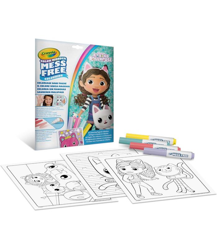 JUEGO PARA COLOREAR: contiene 18 páginas para colorear con los personajes de Gabby y sus divertidos amigos y 4 rotuladores sin manchas Color Wonder