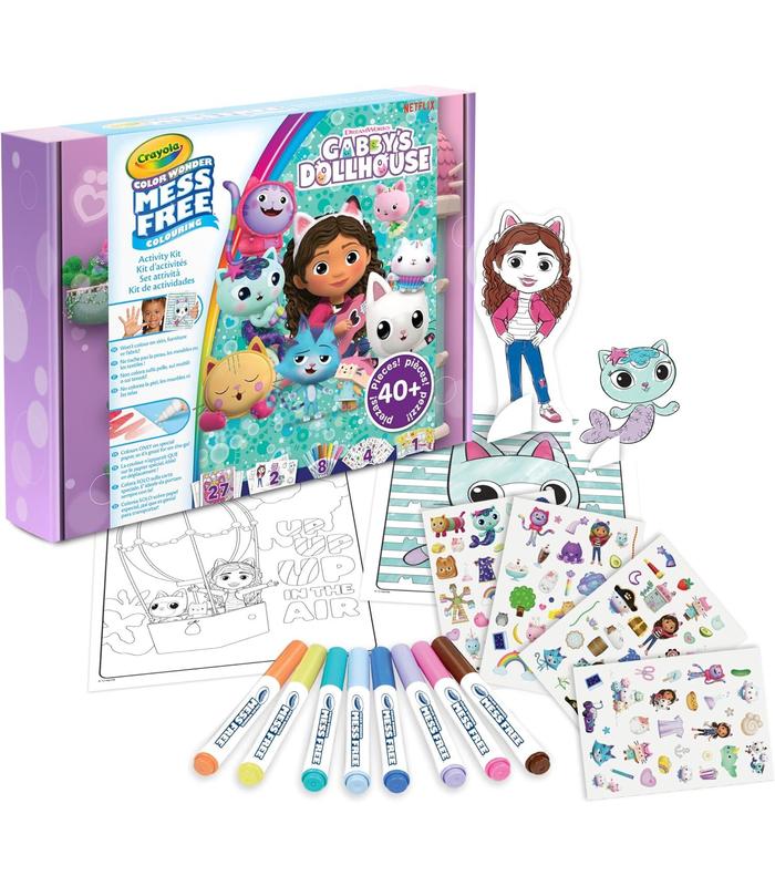Contenido: 1 caja de color temática con la Casa de muñecas de Gabby para guardar todos los materiales, 27 páginas para colorear (de las cuales 9 inéditas) tamaño 20,3 x 25,4 cm, 8 rotuladores que no se manchan, 4 hojas de pegatinas holográficas metalizadas 12,7 x 18 cm, 2 hojas precortadas de personajes