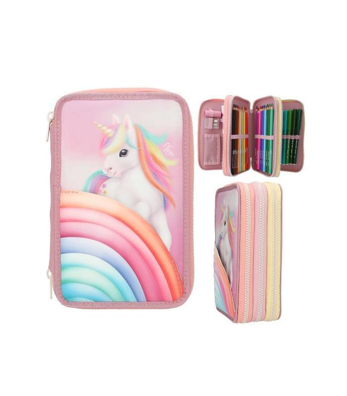 Tan divertido como el arcoíris. El estuche rosa de Ylvi lleva la cara delantera adornada con un unicornio grande y un bolsillo aplicado con la forma de una nube en preciosos colores caramelo. Las tres cremalleras de colores distintos le aportan todavía más colorido a este estuche de 3 pisos que se vende completamente lleno con 18 lápices de colores, 18 rotuladores, 2 lápices, sacapuntas, goma de borrar, regla, tijeras, pegamento en barra e incluso va provisto de un bolsillito interior con cierre de velcro. Material principal: PES 100 por 100.