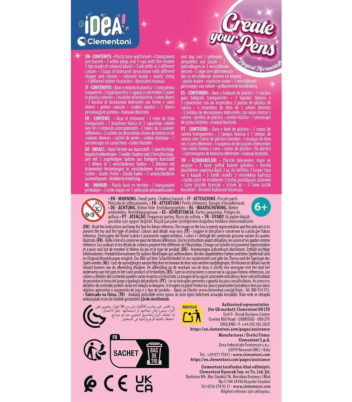 Lo que contiene: juego ideado, diseñado y desarrollado en Italia, con 3 bolígrafos para decorar con tapas, tapas, tintas, decoraciones iridiscentes, cuentas, cordones elásticos y 3 personajes diferentes, con manual para guiar en la composición