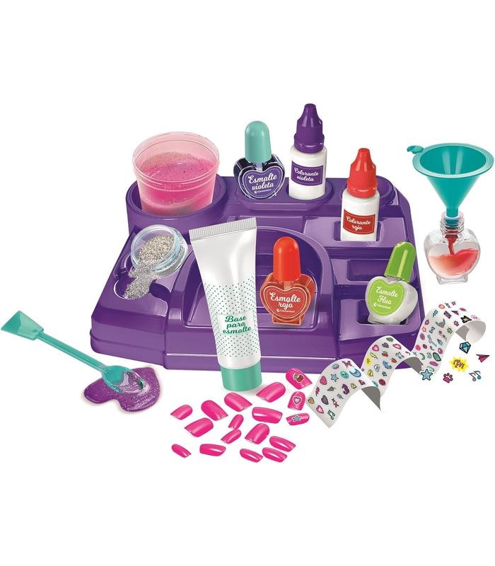 El juego incluye uñas postizas adhesivas y todo lo necesario para crear esmaltes de colores, con purpurina y que brillan en la oscuridad, mezclando la base con los colorantes incluidos en el kit