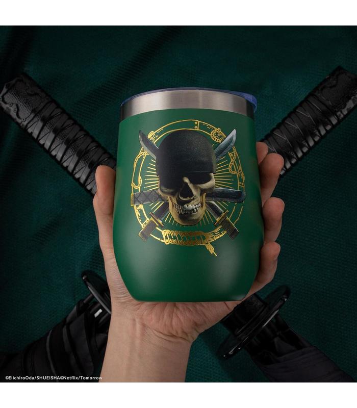 Diseño original: diseñada con un vibrante exterior verde brillante, esta taza de viaje cuenta con el icónico roger alegre de Zoro y la frase "World''s Greatest Swordsman" en la parte posterior.