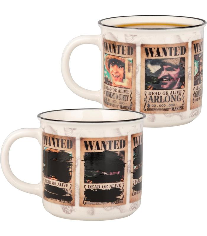 Bebe tu café de la mañana al estilo pirata con esta taza One Piece Heat Change. La taza de cerámica de 350 ml presenta varios carteles de Se busca cubiertos. Añade una bebida caliente y observa cómo se transforma el diseño de la taza a medida que se revelan lentamente los rostros de los piratas buscados. No apto para uso en lavavajillas o microondas. La taza de cambio de calor One Piece es imprescindible para el armario de la cocina.