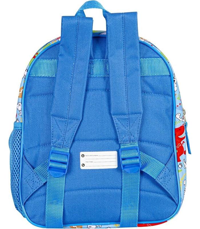 Mochila guardería Compartimento principal con cremallera y gran capacidad Forro interior Bolsillo lateral portabotellas de malla Tirantes acolchados, ajustables y transpirables Espaldera acolchada Asa de mano en la parte superior Tarjeta de identificación personal 280x240x100 mm