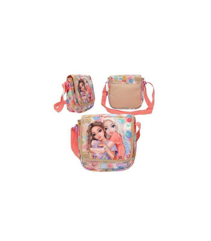 Batch-Boom! Este bolso bandolera de TOPModel en maravillosos tonos beige y coral lleva la cara delantera decorada con dos estilosas modelos rodeadas de parches en imitación de chulísimas pegatinas coloridas, que también adornan los laterales. La bandolera es ajustable. Práctico: la anilla para llevar colgantes. Material: poliéster 100 por 100. Dimensiones: 6,5x20x21 cm aprox.