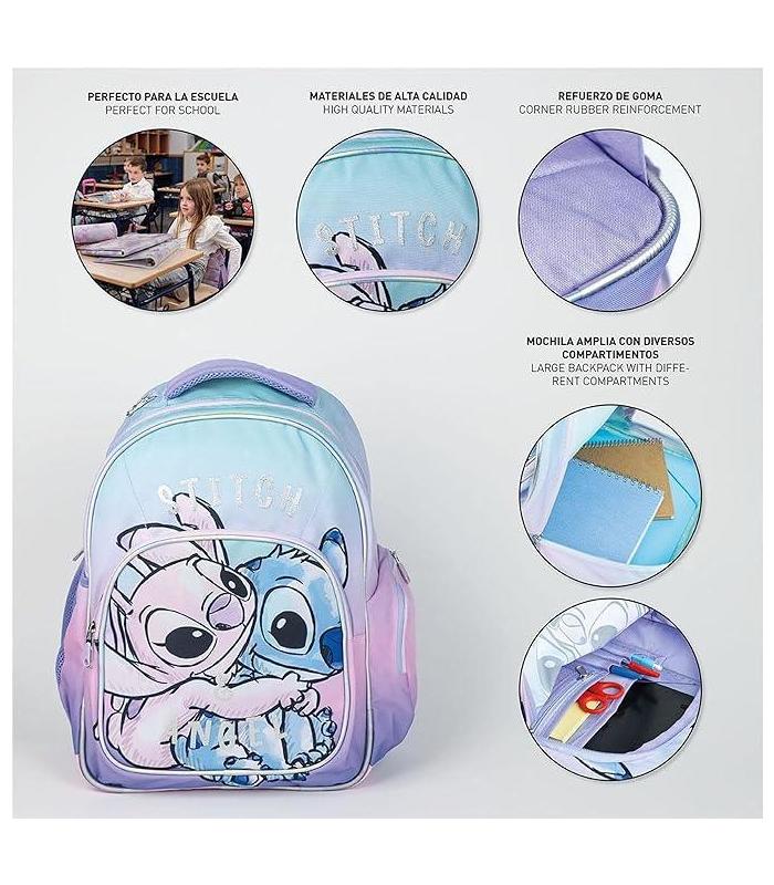 MOCHILA ESCOLAR DE STITCH: Hemos creado las mochilas con 100% poliéster y varios compartimentos para que a tus peques no les falte de nada en el cole. Gracias a su bolsillo lateral, podrán guardar su botella de agua.