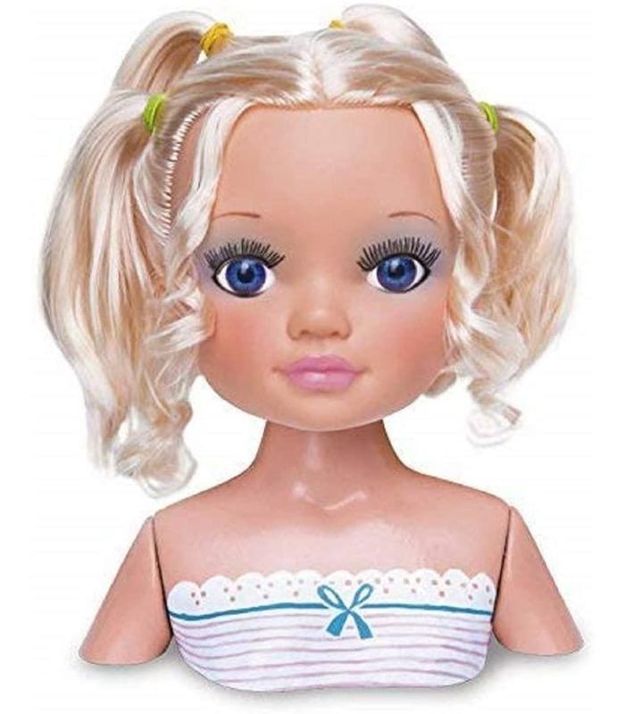 Incluye busto de peluquería y accesorios: peines, brochas para maquillar, pestañaz postizas, pegatinas, purpurina, gomas de pelo, pintalabios…