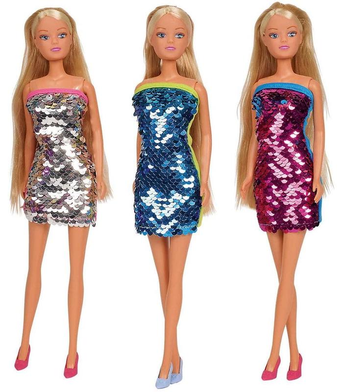 Muñeca Steffi Love de 29cm con un moderno vestido de lentejuelas con efecto swap Pasa la mano por las lentejuelas para hacerlas cambiar de color Cuatro modelos disponibles, recibirás uno de forma aleatoria. Se realiza una selección aleatoria en el almacén. Adecuado a partir de 3 años