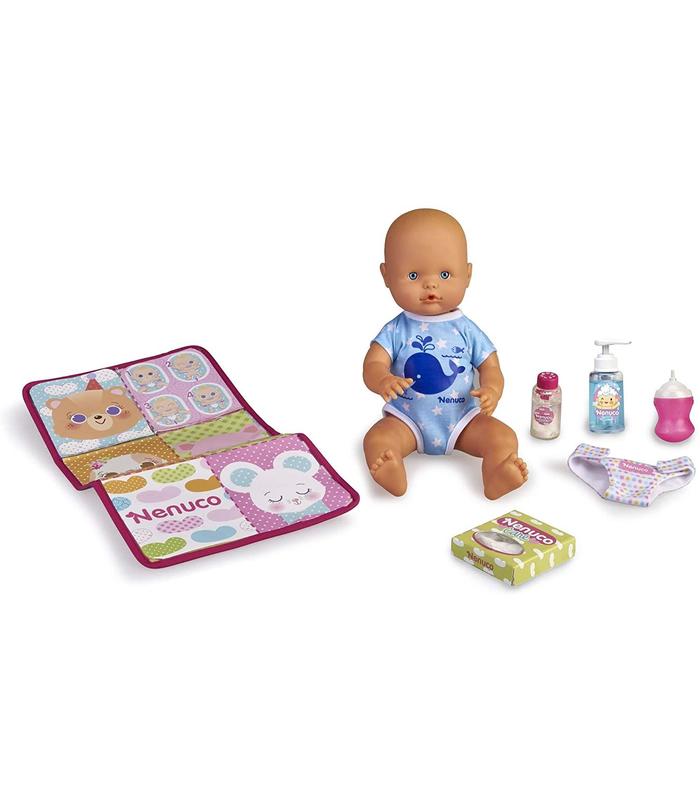 Nenuco ¡Ay qué pipí! es un chico y hace pipí como los bebés de verdad. Después del biberón, toca comprobar si Nenuco se ha hecho pipí… Acuéstalo en su cambiador, levántale las piernecitas… pero ¡cuidado! si hace pipí te mojará con su chorrito. Sécale bien con las toallitas, échale su cremita, unos polvitos de talco y listo para ponerle el pañal. Aprenderás muy rápido a cambiárselo con las instrucciones de su cambiador. Cambiar a Nenuco el pañal nunca antes fue tan divertido. Además su pañal es de tela y se puede lavar para jugar una y otra vez. Incluye 6 accesorios para cambiarle en cualquier lugar: un biberón, un divertido cambiador con instrucciones, botecito con crema, polvos de talco, toallitas y un pañal de tela reutilizable.