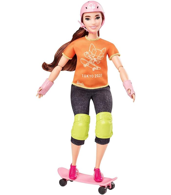 La muñeca Barbie lleva una camiseta naranja, unos pantalones grises, unas zapatillas de skater rosas y también incluye una chaqueta de los Juegos Olímpicos y una medalla de «oro» con cinta
