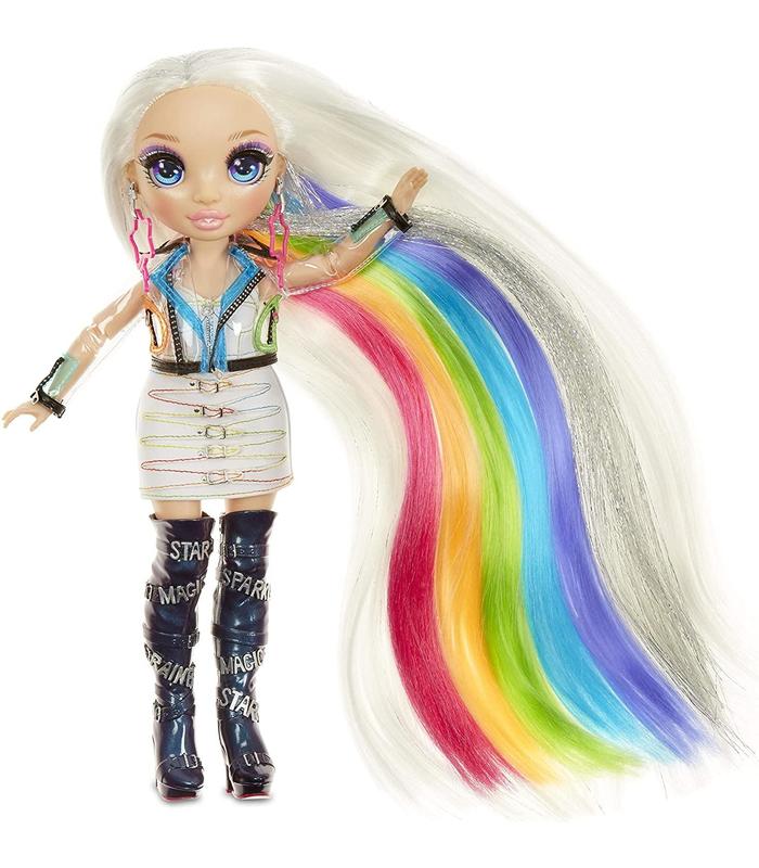 MUÑECA EXCLUSIVA AMAYA RAINE - Su hermoso cabello color platino extralargo con detalles plateados tiene un arco iris debajo. Tiene un traje glamoroso arcoíris con una linda blusa y falda, chaqueta transparente, aretes de estrellas y botas llamativas.