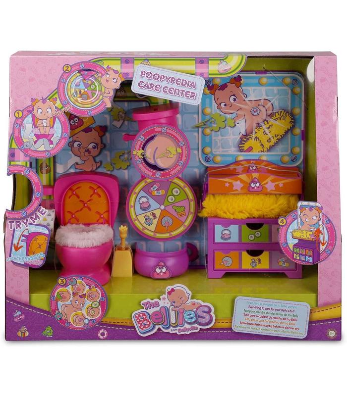 Poopypedia Care Center es el juego perfecto para cuidar el pompis de tu Bellie. ¿Cómo funciona? Primero debes sentar a tu Bellie en el Bellie potty , luego tirar de la cadena y ¡empieza a sonar! Es el momento de comprobar que poop te ha tocado y que cuidadito debes aplicar. Solo tira de la palanca, haz girar la ruleta y lo descubrirás. Aplica los diferentes cuidados que encontrarás en los cajones y no olvides aplicar el abrillantador para un acabado perfecto.. ¡El juego definitivo Bellies ya está aquí! Edad recomendada: + 3 años. No recomendable para menores de 3 años, ya que contiene piezas pequeñas que podrían provocar asfixia en caso de ser ingeridas por el niño/a.