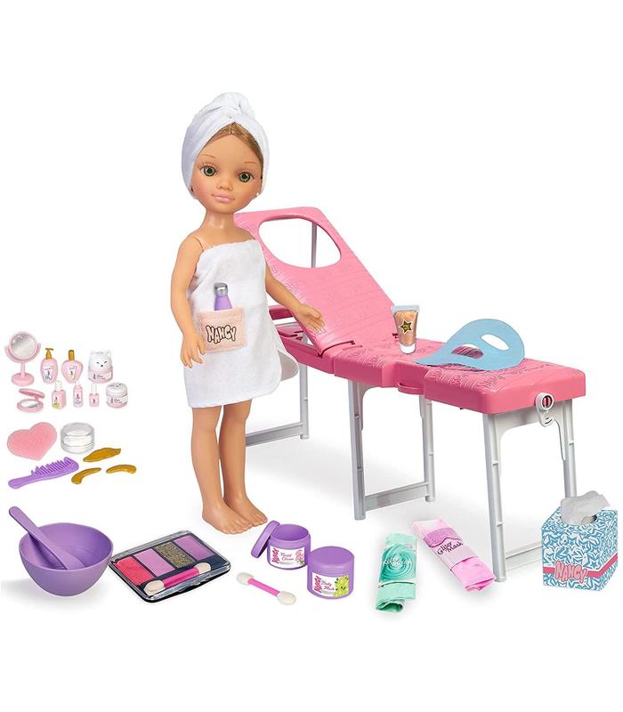 Incluye una muñeca de 42 centímetros castaña e ojos verdes vestida con una toalla de cuerpo y de pelo para hacerse su tratamiento en el spa