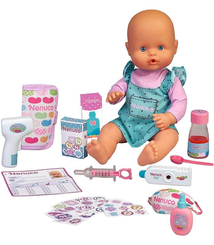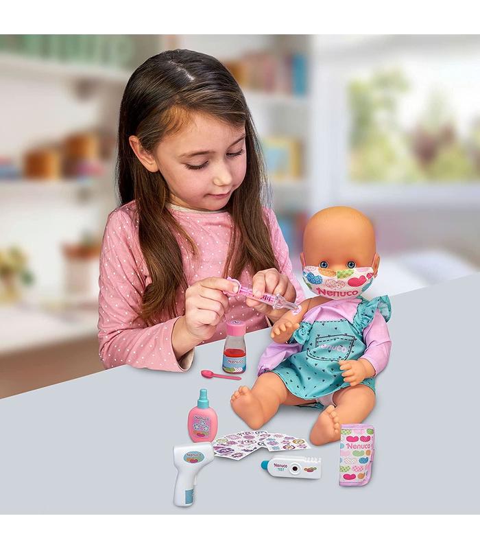 ¿Nenuco está malito? Necesitamos comprobarlo con los accesorios incluidos: termómetro con luz real, test, pañuelo de papel, jarabe, cuchara, chupete, vacuna, tiritas de colores, y cartilla de vacunación en papel con un porta cartillas de tela.