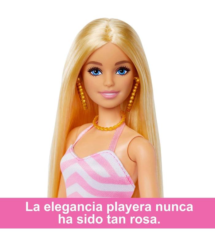 La muñeca Barbie lleva un bonito bañador de rayas rosas y blancas con un pareo de lunares transparente atado a la cintura. Los pendientes de aro dorados y las sandalias sin puntera añaden un toque extra de ternura.