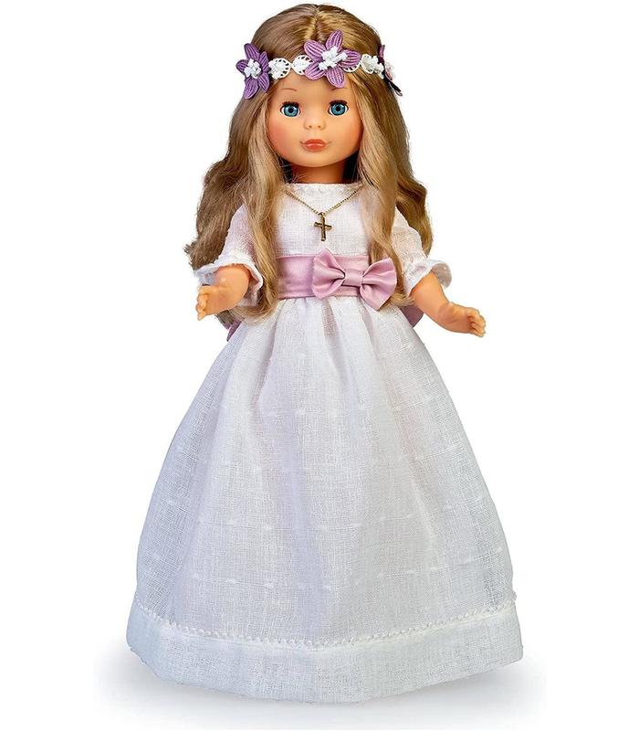 La muñeca va con un vestido blanco estilo de lino con un lazo de tono lila a juego con la corona de flores, igual que una niña en el día de su Primera Comunión; incluye colgante de una crucecita