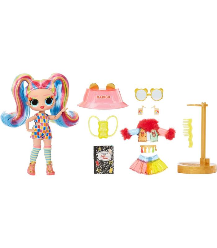 CONSIGUE LA COLECCIÓN LOL SURPRISE HARIBO: El pack de fiesta LOL Loves Mini Sweets Haribo, la máquina expendedora LOL Loves Mini Sweets Haribo y todos los Haribo Tots, incluida la hermanita de Holly Happy, la osita RosyTAMAÑO IN beTWEEN: Holly Happy tiene rasgos bonitos, pelo arco iris en coletas, moda con temática de caramelos y accesorios inspirados en Goldbears. Articulada para muchas opciones de posado; Consejo: las manos son extraíbles para vestirla fácilmente