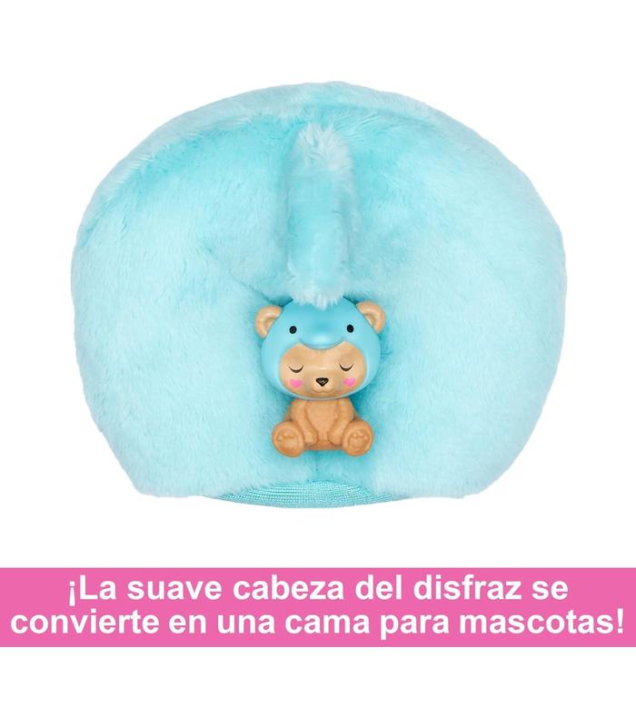 Los niños y las niñas pueden vestir a la muñeca Barbie y añadirle todo tipo de accesorios. Solo tienen que darle la vuelta a la parte superior del disfraz para convertirlo en una chaqueta de pelo muy suave con un estampado moderno. Además, la cabeza del disfraz se transforma en una camita para la mascota.