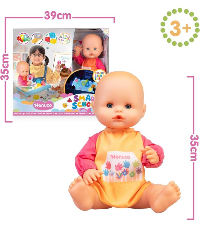Nenuco, el encantador bebé de 35 cm, está vestido con un babi de colegio, listo para aprender. Su cuerpo duro lo hace perfecto para juegos interactivos, y su diseño realista lo convierte en un compañero ideal para las aventuras educativas.
