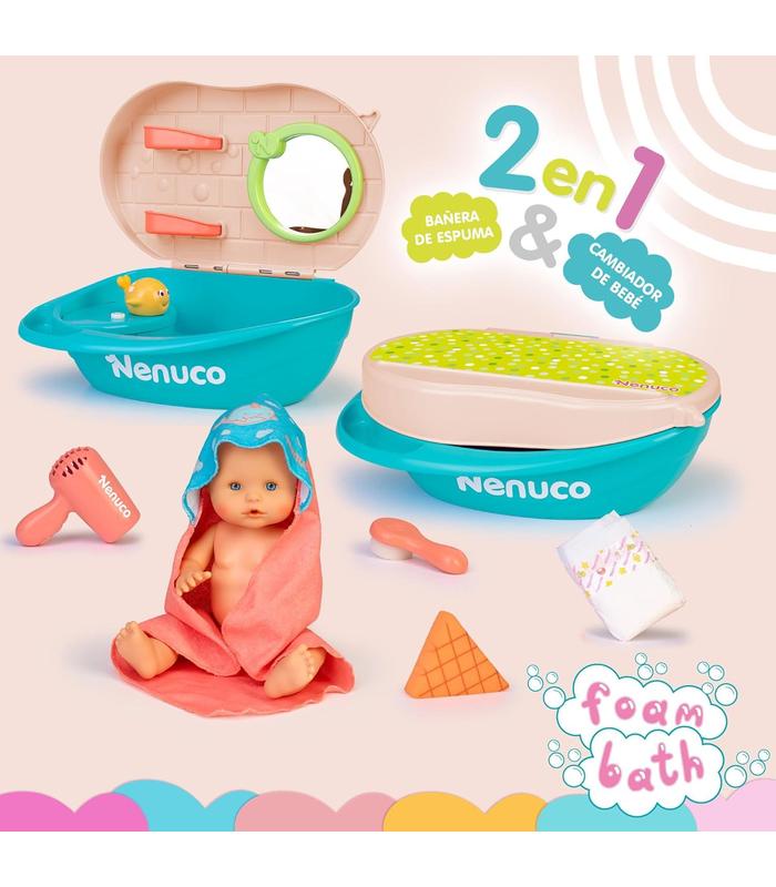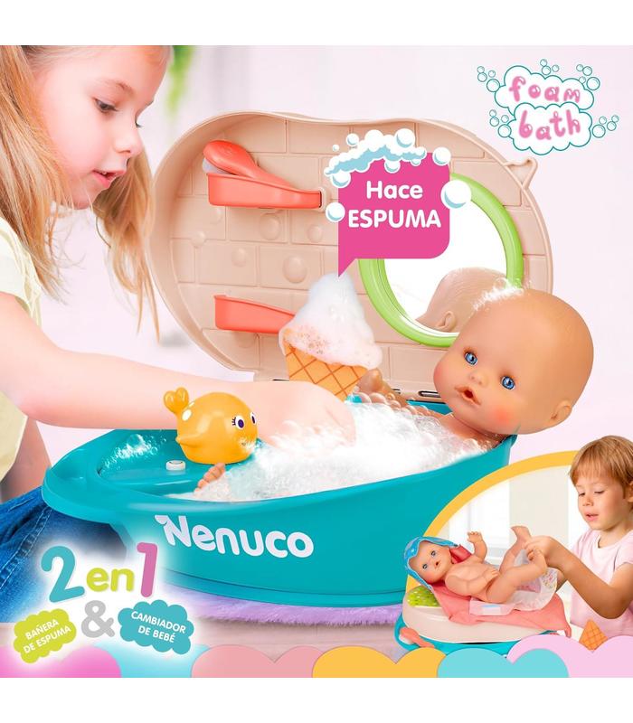 Nenuco Baño de Espuma incluye una innovadora bañera 2 en 1 que no solo permite un baño relajante, sino que también genera espuma real. ¡Transforma el tiempo de juego en una experiencia de spa con burbujas para tu muñeco bebé!