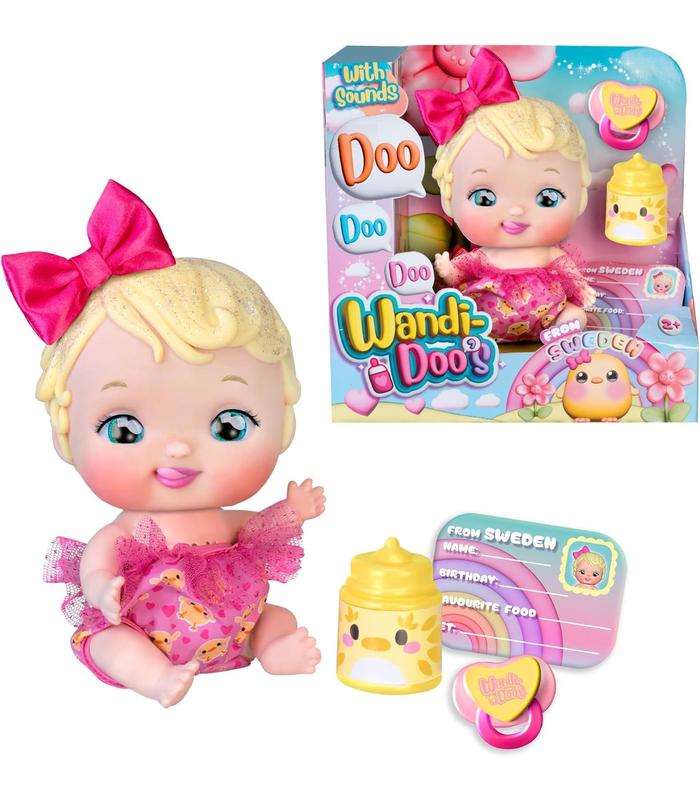 Wandi-Doo From Sweden se comunica en el lenguaje universal de los bebés, diciendo "doo, doo, doo". Este adorable bebé muestra emociones, se ríe, se enfada y bosteza cuándo tiene sueño, ofreciendo una experiencia interactiva y realista.