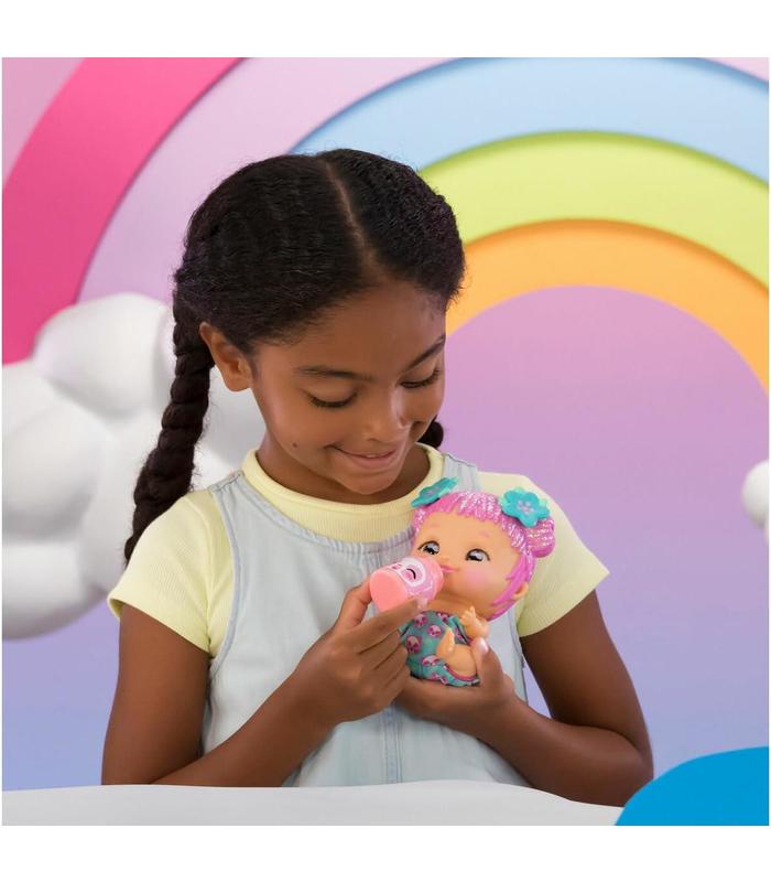 Viste un pañal con diseño de ositos panda y su pelo rosa está recogido en dos moñitos adornados con flores. Incluye dos accesorios a juego: un biberón para alimentarla y un chupete con imán para calmarla cuando esté cansada.