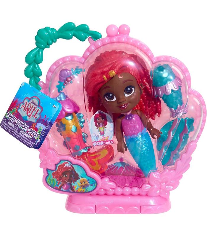 La muñeca y los accesorios incluyen: 1 muñeca Ariel, 2 colas, 3 aletas, 1 top peplum, 1 tiara, 1 estuche.