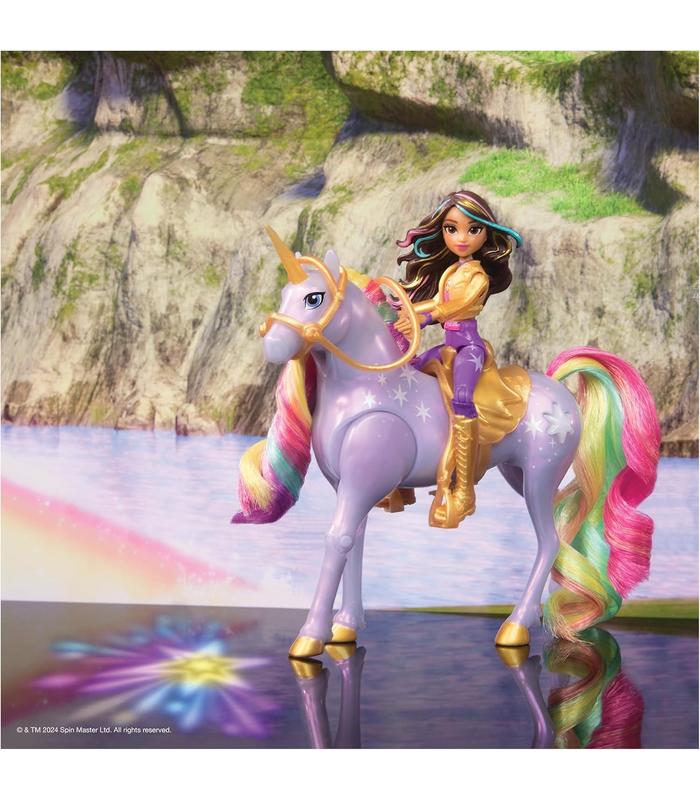 INCLUYE: 1 muñeca articulada Sophia, 1 unicornio Estrella con luces de arcoíris, 1 montura extraíble, 1 brida extraíble