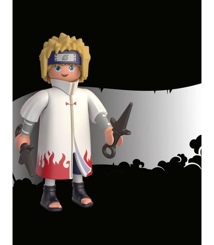 El set de PLAYMOBIL incluye al personaje de NARUTO SHIPPUDEN, Minato, con cabello rubio, ojos azules y una banda en la frente. Como Hokage, lleva el característico manto blanco y rojo y tiene dos Kunai.