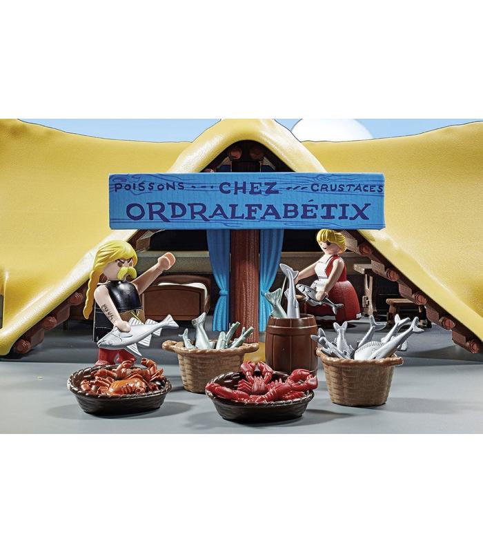 La cabaña de Ordenalfabetix está equipada con dos camas, así como una chimenea, una mesa y taburetes de madera. En varias cestas, el pescado y el marisco están listos para la venta.
