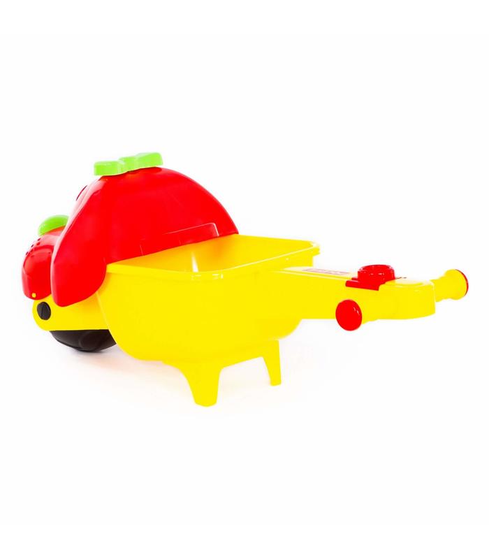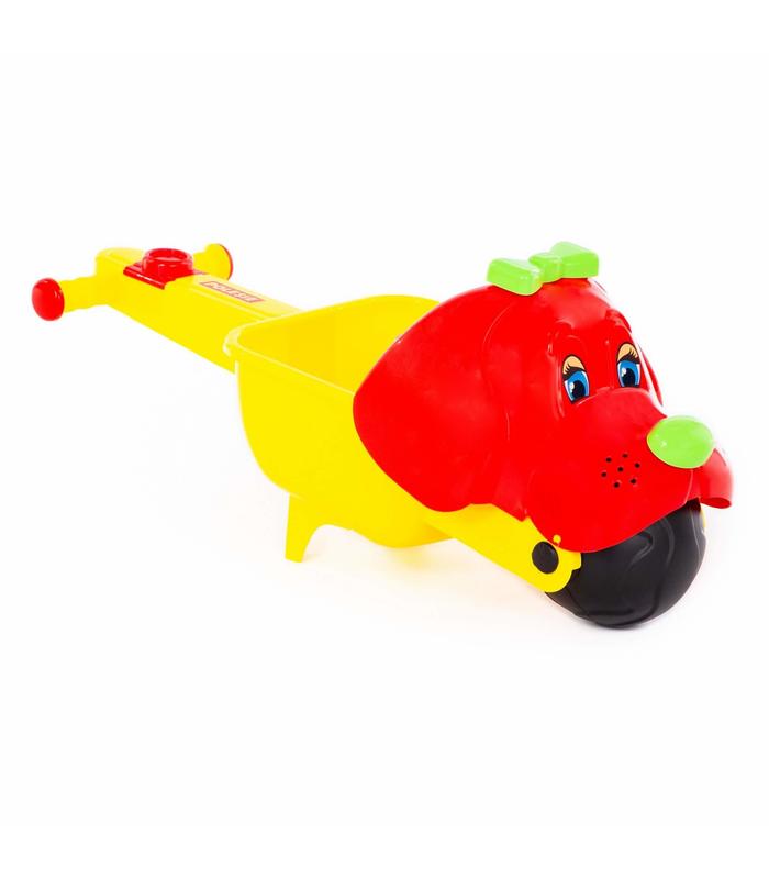 La carretilla es de colores brillantes con diseño del perro de color rojo en la parte delantera