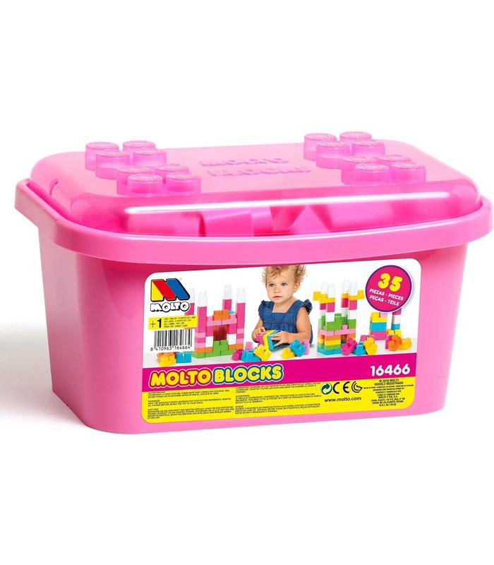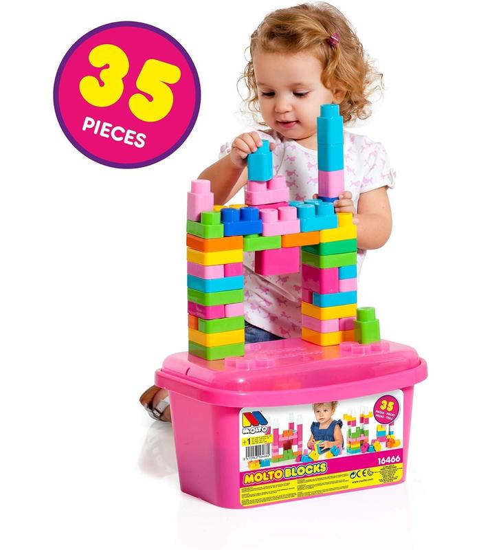 ¡Perfecto juguete para grandes construcctores! Con esta completa cubeta bloques de Molto con 35 piezas, tu peque podrá construir estructuras y figuras sin parar. Este juguete ayuda a los peques a desarrollar la imaginación, creatividad, psicomotricidad y habilidad manual.