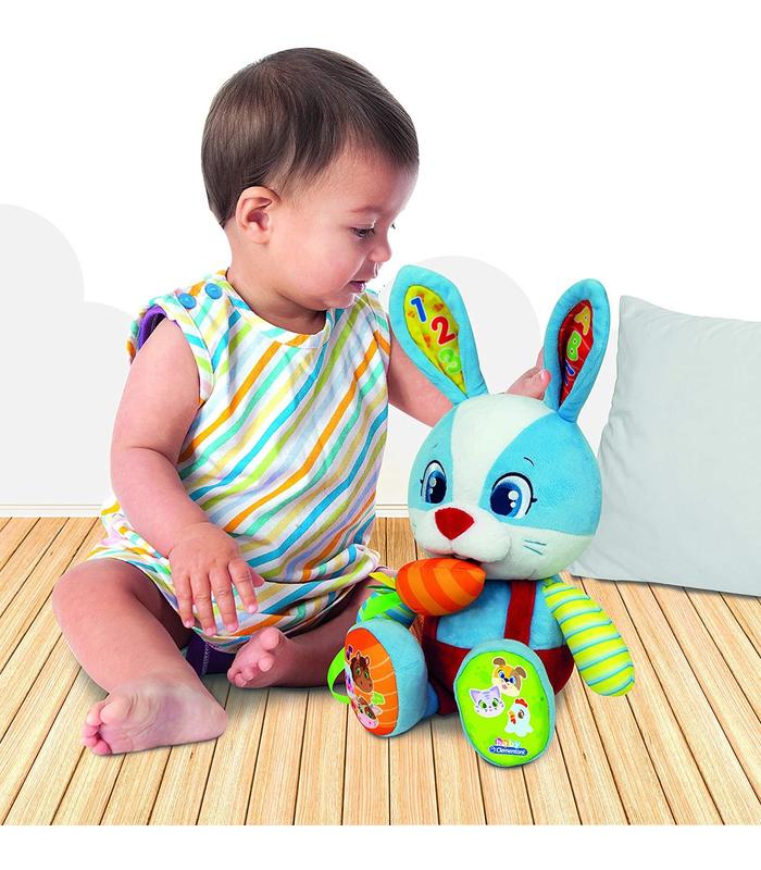 Este peluche es también un centro de actividades diseñado para ayudar a los niños a aprender las letras, los números, palabras y sonidos de los animales con los botones de aprendizaje situados en las patas