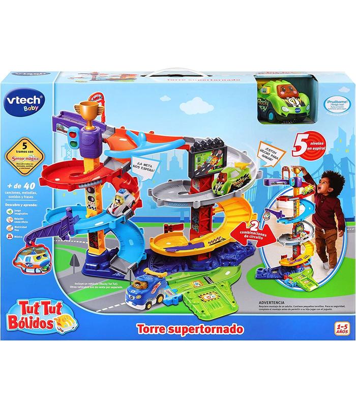 La Torre supertornado es un gran circuito en espiral para los Tut Tut Bólidos, con el superbólido Rocky incluido. Sus pistas se pueden combinar para crear dos recorridos distintos: Modo Carreras: al pulsar la copa o el semáforo, los bólidos salen disparados desde el lanzador y bajan por cualquiera de las dos pistas de descenso. Modo Gran Eslalon: la torre se eleva hasta lo más alto para que los bólidos desciendan a toda velocidad dando giros por los tramos en forma de espiral.